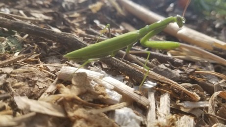 Au cours de la préparation d’une nouvelle planche de radis, j’ai croisé une mante qui s’est réfugiée au milieu des pieds de tomate voisins.