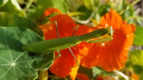 Une capucine est tout ce qui restait de la culture précédente. Voici notre mante escaladant la touffe colorée.