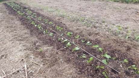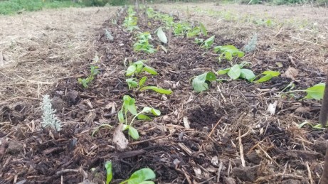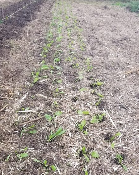 Les premiers épinards sont installés en plein champ. La planche voisine entre dans le plan d’implantation des lignes de syntropie.