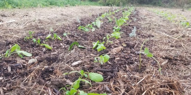 Les premiers épinards sont installés en plein champ. La planche voisine entre dans le plan d’implantation des lignes de syntropie.