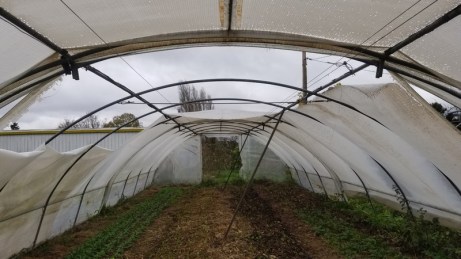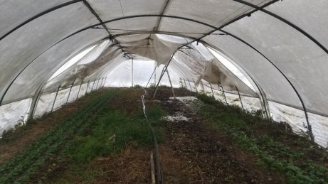 Après la neige la pluie. Des petites piscines se forment là où le plastique n’est pas assez tendu. Pourvu que les fixations résistent à la tension, le temps d’organiser un chantier de réfection complète !