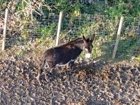 Peut-être intrigué par le vrombissement, l’âne voisin fait le tour de son enclos.