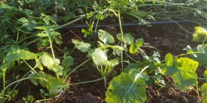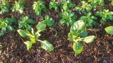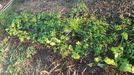 Un peu plus loin, le mélange mâche-bette est déjà partiellement récolté. La couverture dense de mâche a été largement éclaircie. Les dernières seront bientôt récoltées.