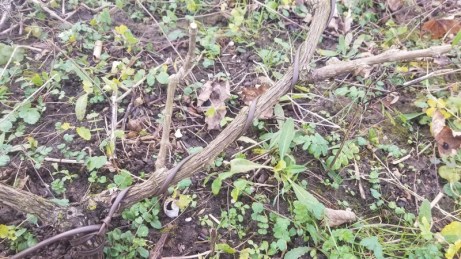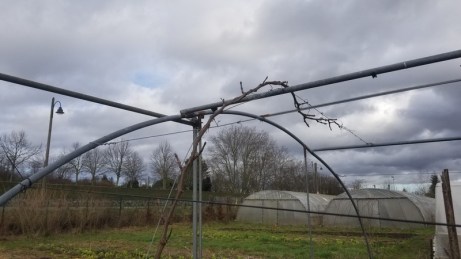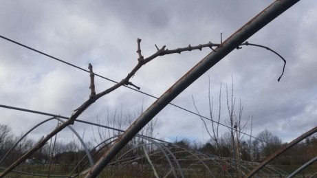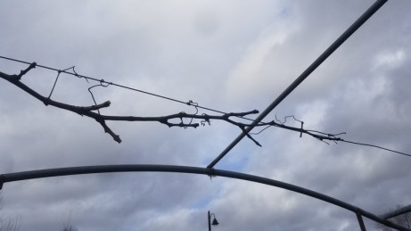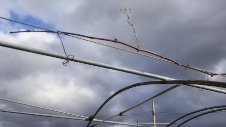 J’ai planté quelques pieds de vigne à la base d’un tunnel débâché. Les sarments sont guidés vers les arceaux pour constituer progressivement une tonnelle fruitière.