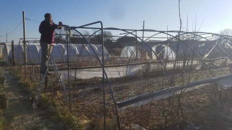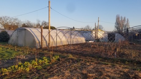 Des 7 tunnels abîmés par la tornade de 2021, 4 avaient pu être remis en service, 1 est irréparable et devra être démonté. Les 2 derniers gardaient des bonnes parties qui laissaient la possibilité d’en reconstituer un bon. Ce projet a connu une avancée décisive hier, avec l’aide d’une équipe de choc, sous un beau soleil d’hiver.