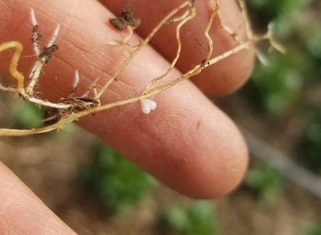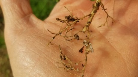 Cette luzerne, une fabacée comme les trèfles, haricots, fèves, etc., constitue des nodules sur ses racines pour héberger une bactérie fixatrice d’azote.