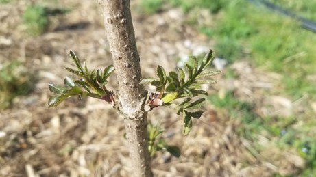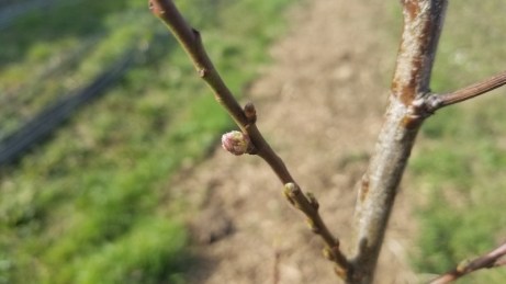 Un jeune pêcher dont la première fleur est déjà presque éclose…