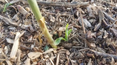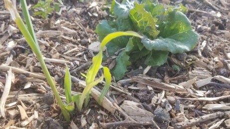 C’est en fait un semis direct de maïs, caché sous l’ail pour tenir à distance les corneilles, pies et autres oiseaux fouilleurs.