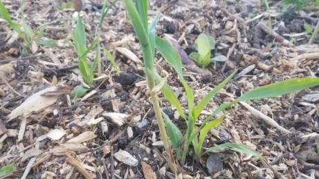 Je ne suis pas sûre que cela marche à tous les coups, mais cette fois ci c’est une réussite. Alors que les pois ont été dévastés consciencieusement à quelques mètres de là, les maïs sont bien partis !