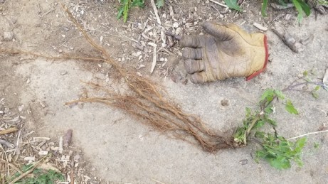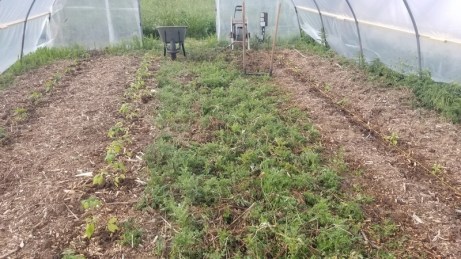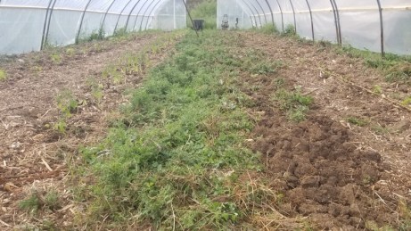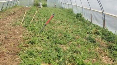 Le travail en est à ce stade. Il reste encore une solide bande de chardon au centre, à retirer avant de pouvoir planter les dernières tomates.