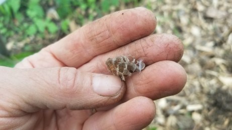 Mystère au pays des guêpes ! Une demi-douzaine de nids de guêpe poliste étaient actifs cette année dans les différents abris de culture. Ce sont de bons auxiliaires qui nourrissent leurs larves avec des petites chenilles et œufs de divers ravageurs. A la fin de l’été, je les ai vus disparaître l’un après l’autre, bien avant le moment où les populations devraient être décimées par le froid. J’ai retrouvé l’un d’eux entier par terre, décroché de son pied. Les autres étaient mis en pièces, jetées au sol.