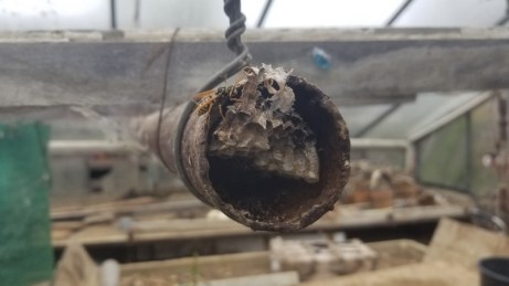 Un nid était logé dans un tube de la serre à plants. C’est le seul à ne pas avoir été entièrement détruit ou décroché. Il a quand même été diminué de la partie qui dépassait du tube.