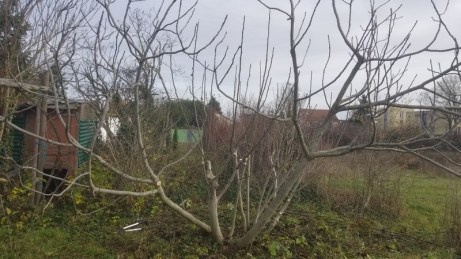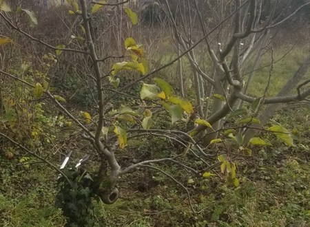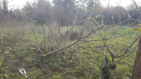 Certains petits arbres se sont largement laissés envahir. Ici un petit poirier est masqué par des panais secs et quelques cornouillers. Le lierre dense qui l’entoure grimpe dans les branches.