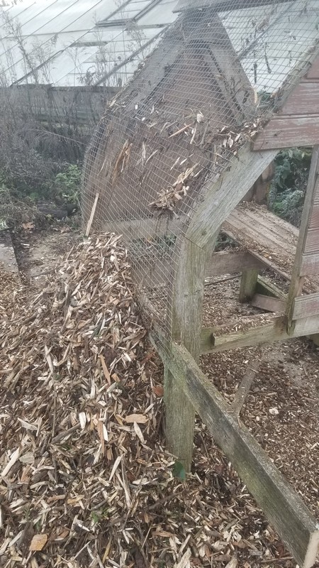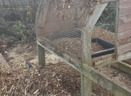 Le poulailler désaffecté et en partie démonté s’abîmait en bordure des framboisiers. J’ai décidé d’utiliser la structure pour tamiser le compost.
