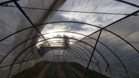 Un petit tunnel a craqué sur toute la longueur. Il contient les épinards, de la mâche et des betteraves. Ces cultures perdent le doux réchauffement des jours où le temps sera beau.