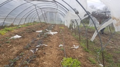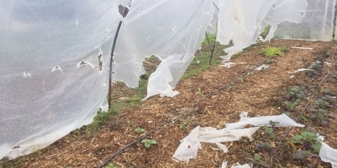 Un grand tunnel a perdu un angle de couverture. Des jeunes laitues, la coriandre, une partie des claytones de Cuba, se retrouvent ainsi exposées aux rigueurs de l’hiver.